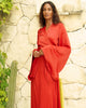 Amara meaning eternal can be found in this timeless design with a wrap silhouette for effortless elegance in motion. Featuring extra-wide, flowing sleeves, a gracefully attached belt, and discreet loop seams along the sides for effortless wrapping, this piece moves with both ease and beauty. Crafted in soft, breathable EcoVero — a fabric gentle on the earth and fluid on the body — it offers a luxurious drape and subtle shine that complements the intensity of the color.